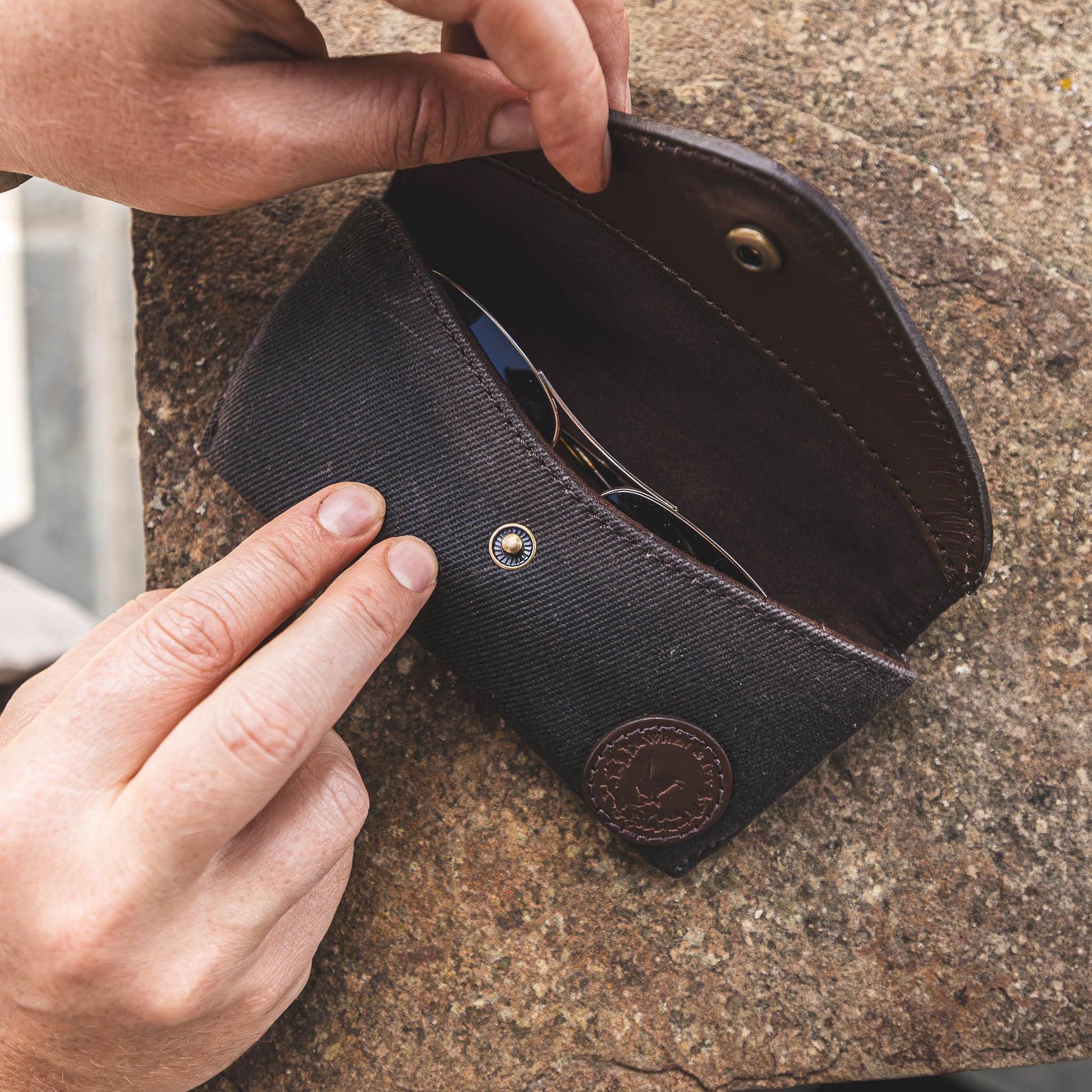 The Essentials Eyewear Case, the ideal companion for those who value functionality and style in every detail. Meticulously crafted from durable waxed twill canvas and rich vegetable-tanned bridle leather, this case offers robust protection for your eyewear. The addition of solid brass hardware not only reinforces its structure but also elevates its overall appearance. Whether venturing into the great outdoors or navigating the urban jungle, the Essentials Eyewear Case ensures your glasses are always secure and within reach.