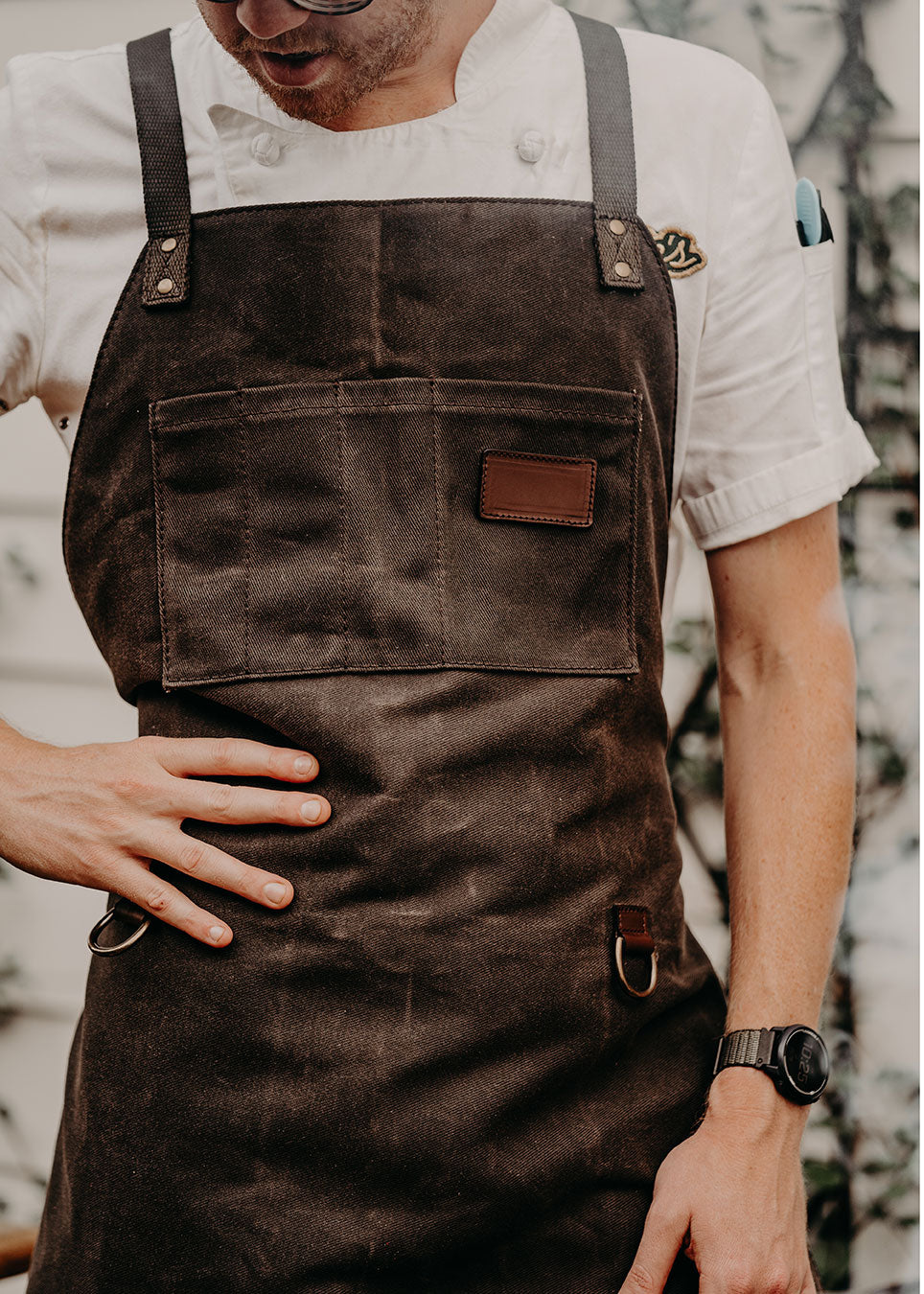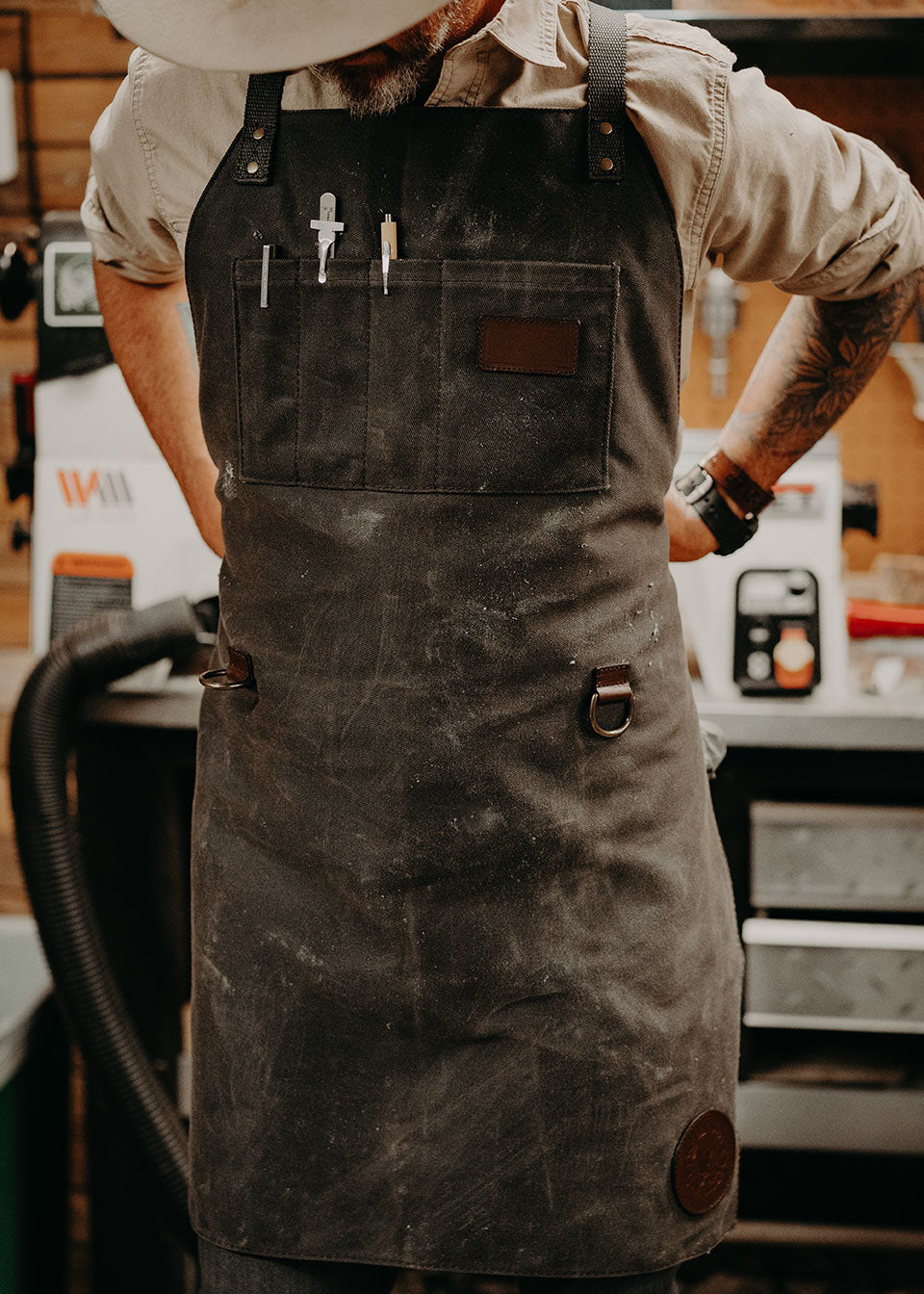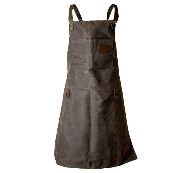 Whether you’re cleaning guns after a hunt or grilling out with family and friends, the Shop and Cookhouse Apron will keep you--and your clothes--protected in style.& Four chest pockets hold tools and utensils, and two solid brass d-rings allow you to attach your go-tos for easy access. Our strap system crosses over your shoulders to distribute the apron’s weight, keeping you (and your neck) comfortable while you work. Made of vegetable tanned bridle leather, waxed twill canvas, and solid brass hardware. As with all Wren & Ivy Sporting and Travel Gear, embossing is included. Limited Lifetime Guarantee.